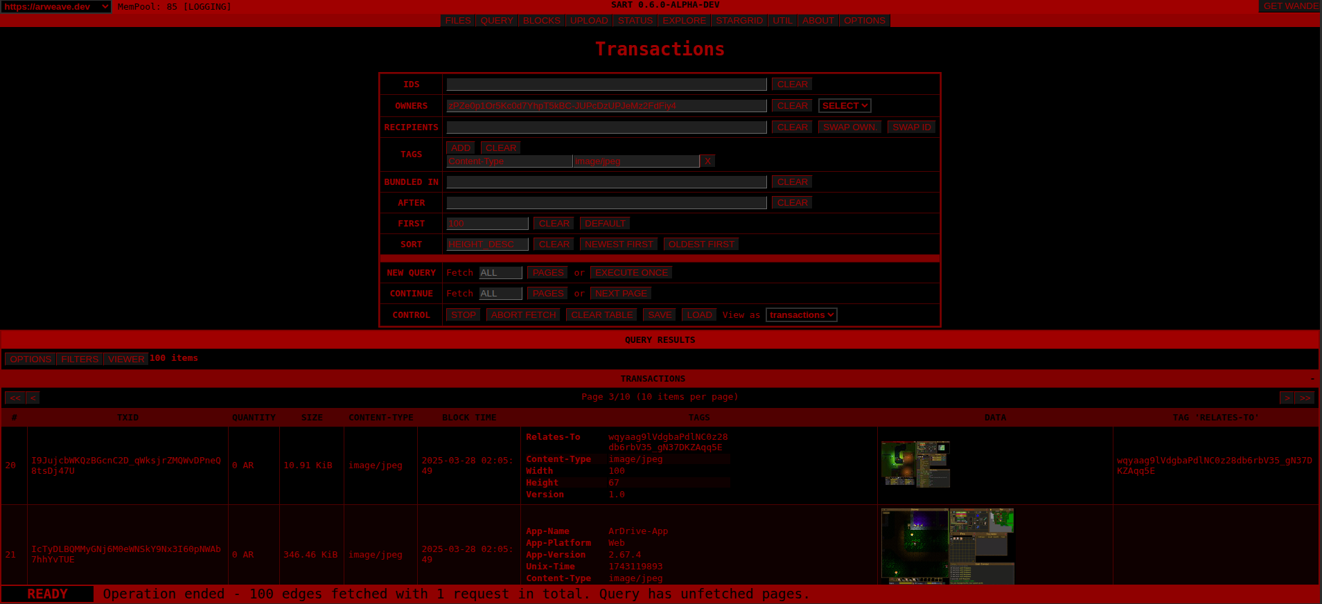 SART is web-based Arweave-utility for content discovery, statistics and management (CDSM) designed to suit the needs of tech-savvy users. Its current capabilities are limited to querying transactions (albeit with advanced sorting and filtering) and do some basic data-analysis on the results.